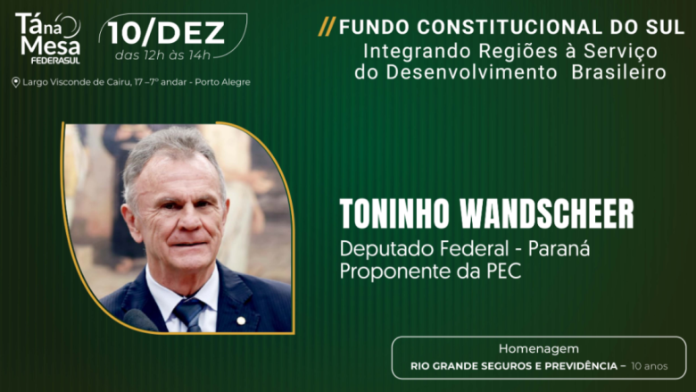 O encontro será realizado no dia 10 de dezembro, das 12h às 14h, com o tema: “Fundo Constitucional do Sul: Integrando Regiões a Serviço do Desenvolvimento Brasileiro”.