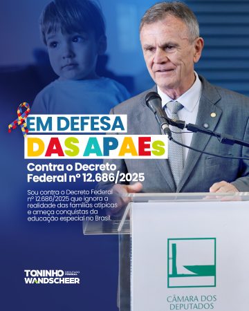 O deputado federal Toninho Wandscheer (PP) divulgou nesta quarta-feira (28), que se posiciona contrário ao Decreto Federal nº 12.686/2025, publicado pelo Governo Federal, que altera a política de educação especial no país. Segundo ele, apesar de apontar supostos avanços, a medida preocupa famílias, educadores e instituições, especialmente as APAEs.